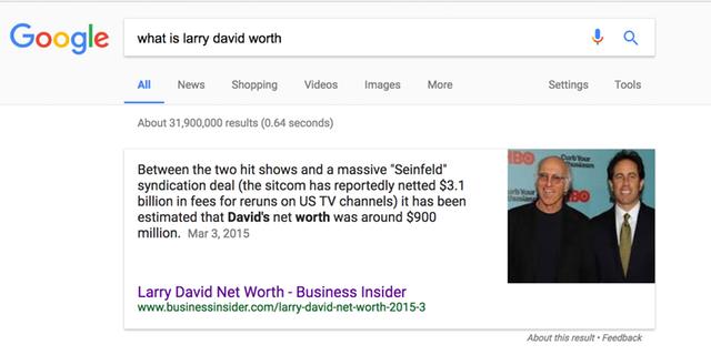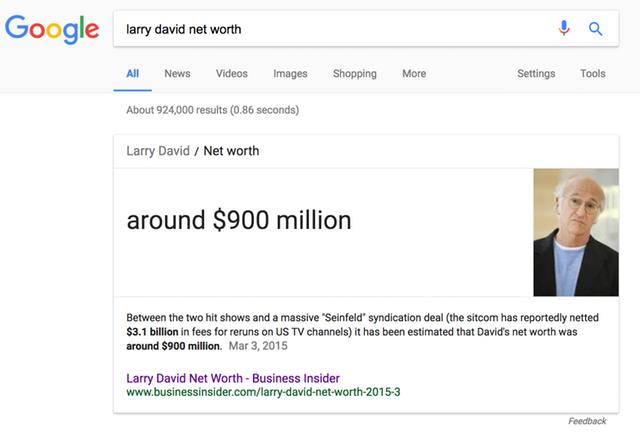 截止到写稿时,“Larry David的身价”以及“Larry David值多少钱”的查询返回的都是9亿美元,但来源都是Business Insider。Business Insider的故事说“据估计”Larry David身家有9亿美元以上,并且链接到了财富市场洞察机构Wealth-X的一份新闻公告。然后再引用了CelebrityNetWorth稍低一点的4亿美元,并且引用Larry David在跟Charlie Rose对话时的说法,当时他说自己身家连5亿美元都不到。