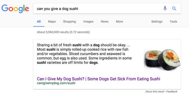 搜索“狗可以吃寿司吗”返回的Featured Snippet(精选摘要)片段,截图时间是2017年4月17日