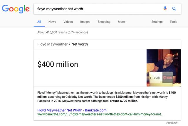 搜索“梅威瑟身价”直接从Bankrate.com提取出来的答案,而这个答案Bankrate.com其实是援引另一来源的。