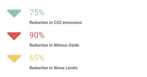 图解:二氧化碳排放量下降75%;一氧化二氮排放量下降90%;噪音减少65%。