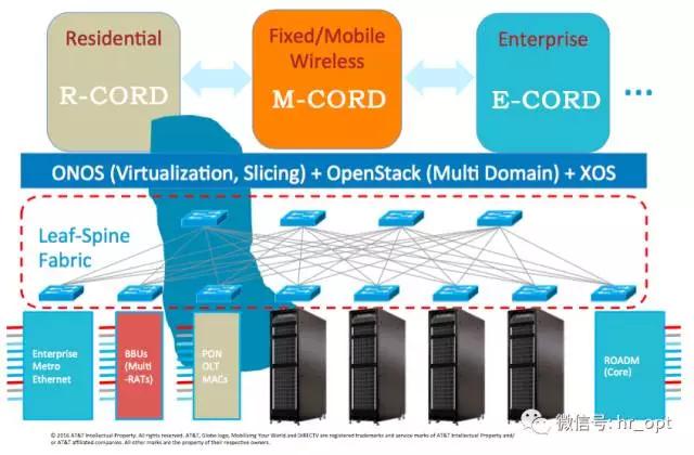 而在CORD构架中,通用服务器和白盒交换机与OpenStack,Docker,ONOS和XOS等开源软件相结合,提供可灵活支持各种应用的可扩展平台。同时,数据中心DC内部采用Spine-Leaf架构,实现内部无阻塞交换。