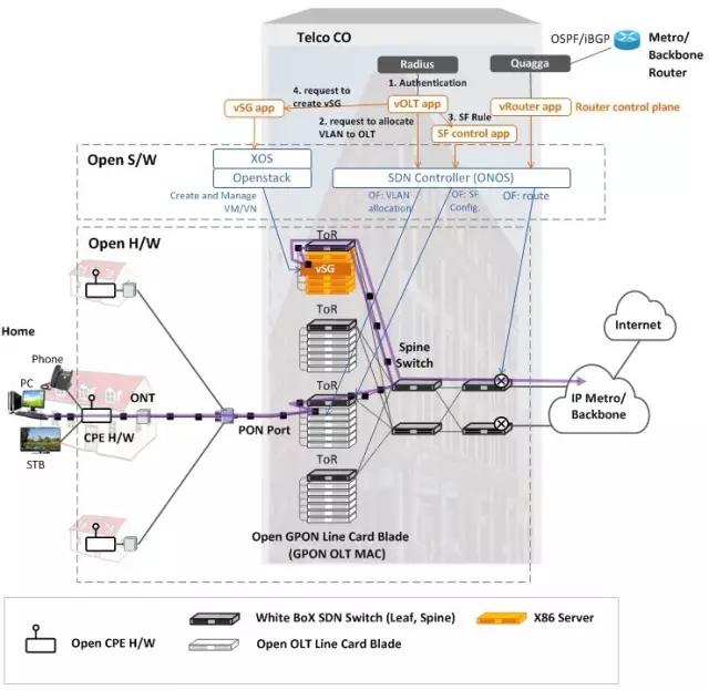 ①引入白盒SDN交换机、X86服务器、开放OLT刀片和开放ROADM刀片等这些开放硬件,和ONOS、Openstack、XoS等开放软件,来重构网络。