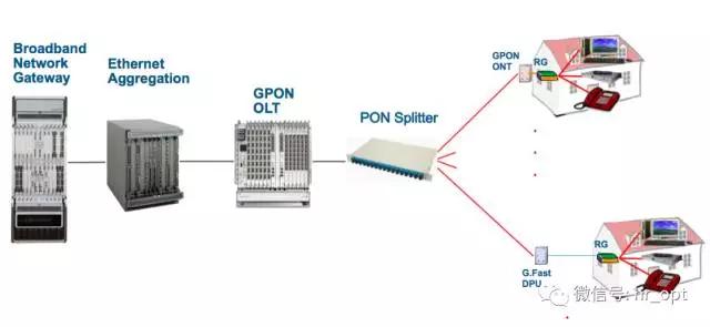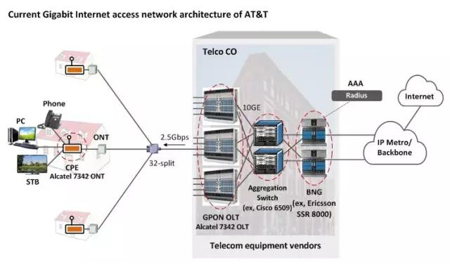 AT&T的传统GPON构架和我们一样,用户家里的CPE(客户终端设备)连接中心机房的GPON OLT。中心机房设备有:OLT、汇聚交换机和BNG设备,均来自传统的电信设备运营商。