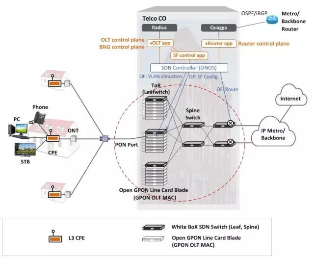 至于传统网络中的控制面,现在由一个叫vOLT APP的应用来统一处理。vOLT APP与Radius服务器(负责远端用户拨入验证)、SDN控制器(负责每用户VLAN在OLT线卡刀片中的分配)、SF控制应用(负责交换核心的路由配置)协同工作。
