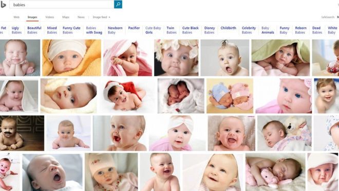 使用bing搜索“婴儿”图片,首屏只有白皮肤婴儿的结果。