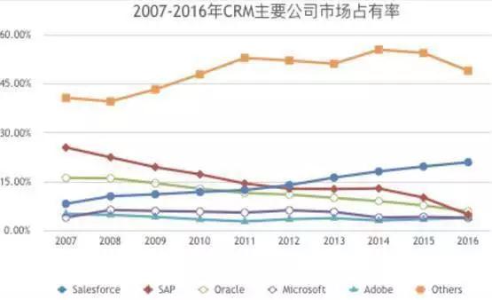 2016财年,Salesforce的营收达到 84亿美元,比上一年增长 25.87%。根据数据分析公司Gartner的数据,Salesforce今天在CRM市场占有率方面占有绝对优势,而且从2012年开始,它的优势变得越来越明显。下图可以直观反映主要的CRM公司的市场占有率的变化: