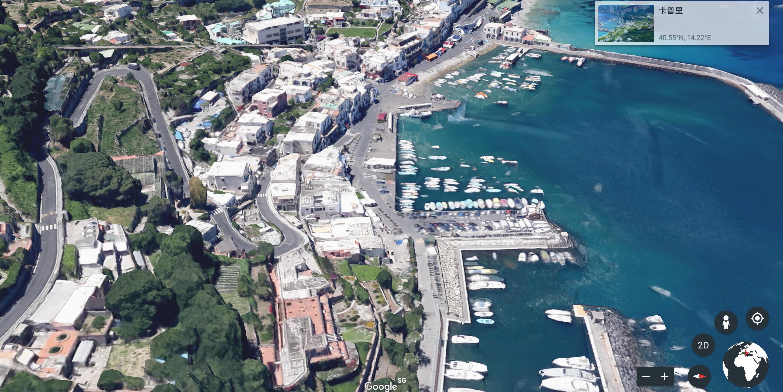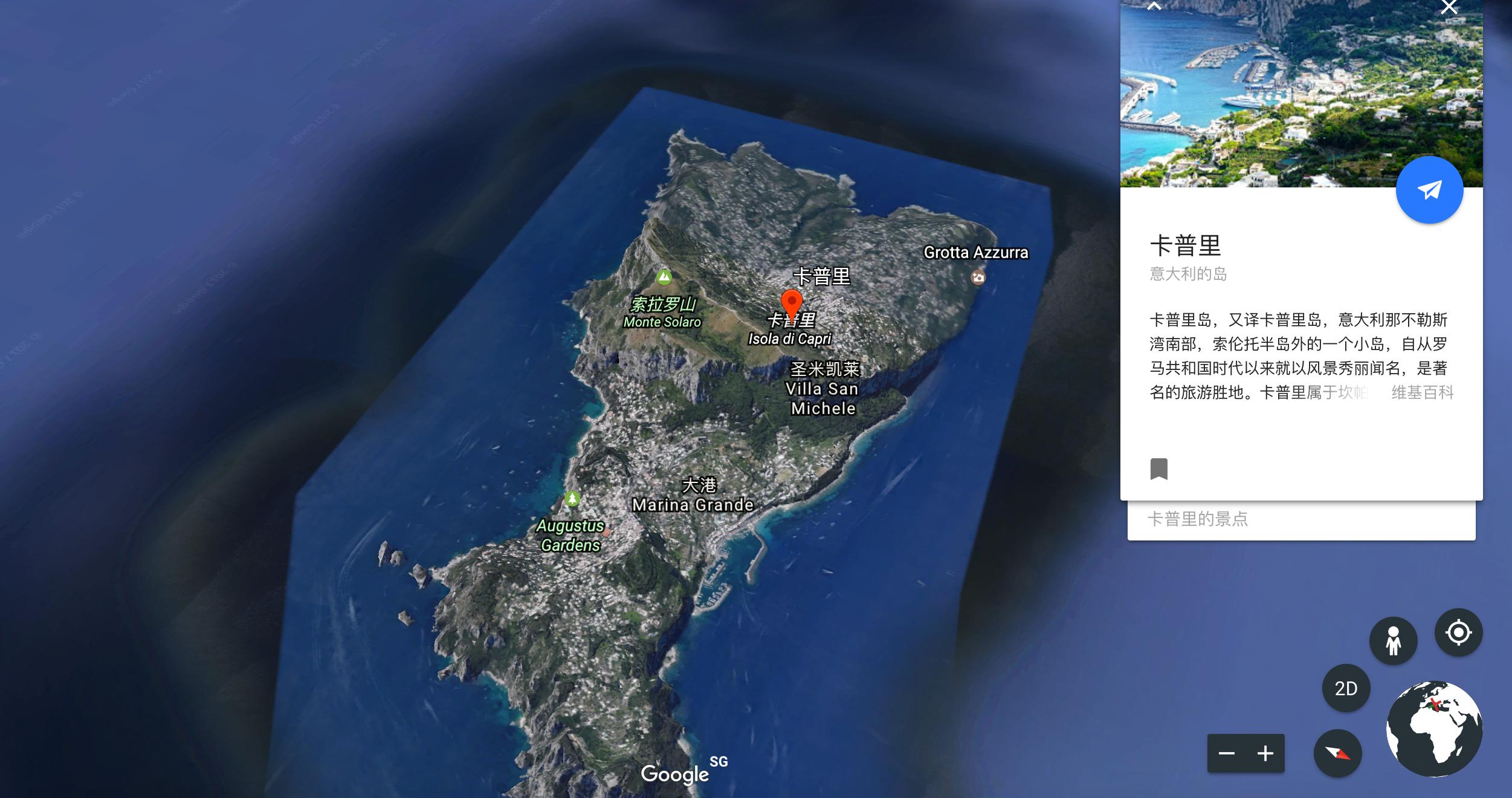 我随意点了一下,被传送到了意大利的卡普里。虽然从未听说过这个地方,但是右侧的维基百科可以帮我。再深入这个岛,被她的美貌所迷惑,几乎是流连忘返,恨不得立即实地去看看了。