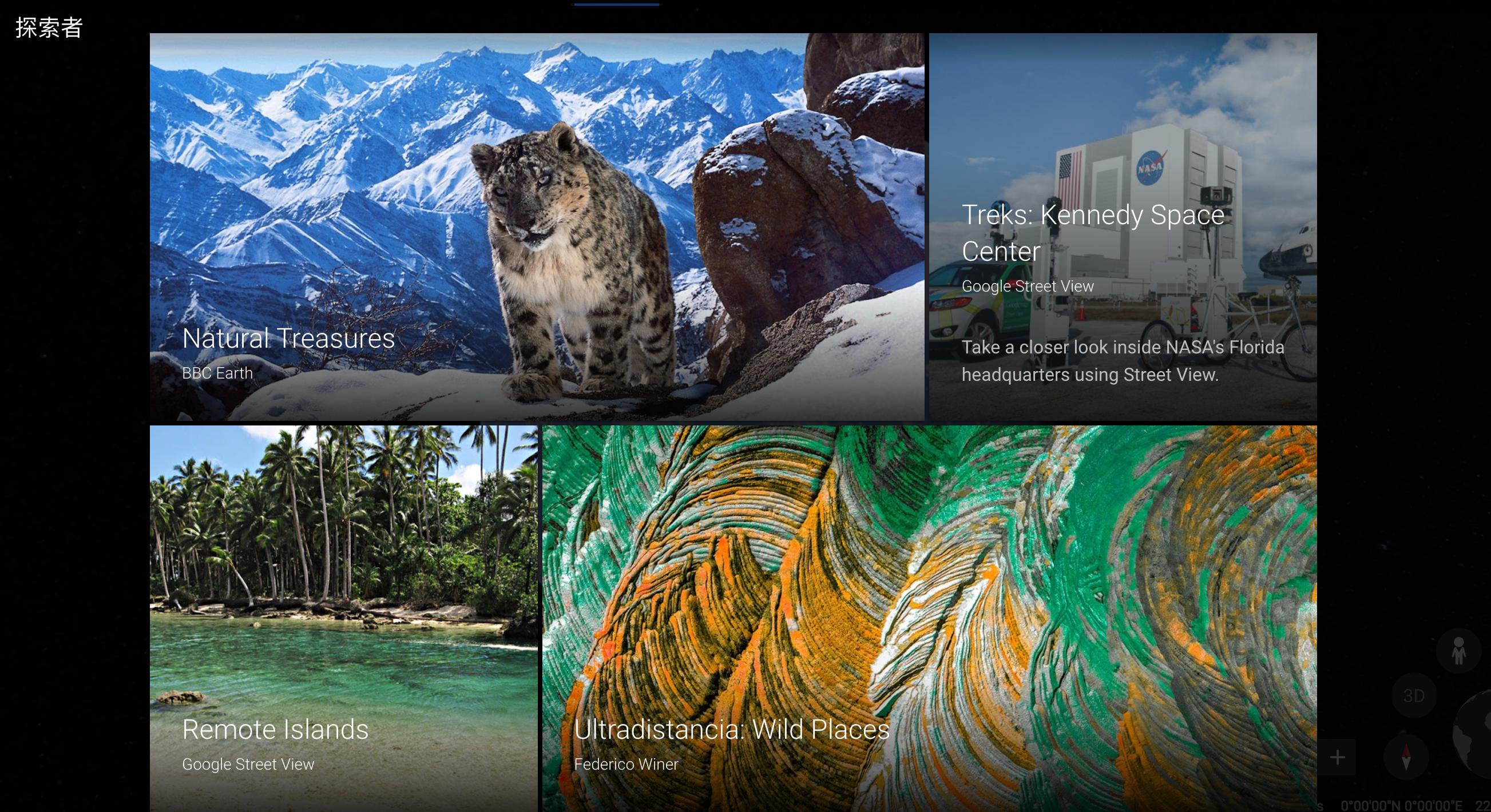 首先是左上角的航海图标(Voyager),顾名思义,航海家代表的是探索世界,Google在最新版本中跟BBC和Digital Globe等等一些内容生产商合作,把故事放进这个巨大的地球里,讲解世界各地令人难以置信的自然多样性,充实浏览的信息量。