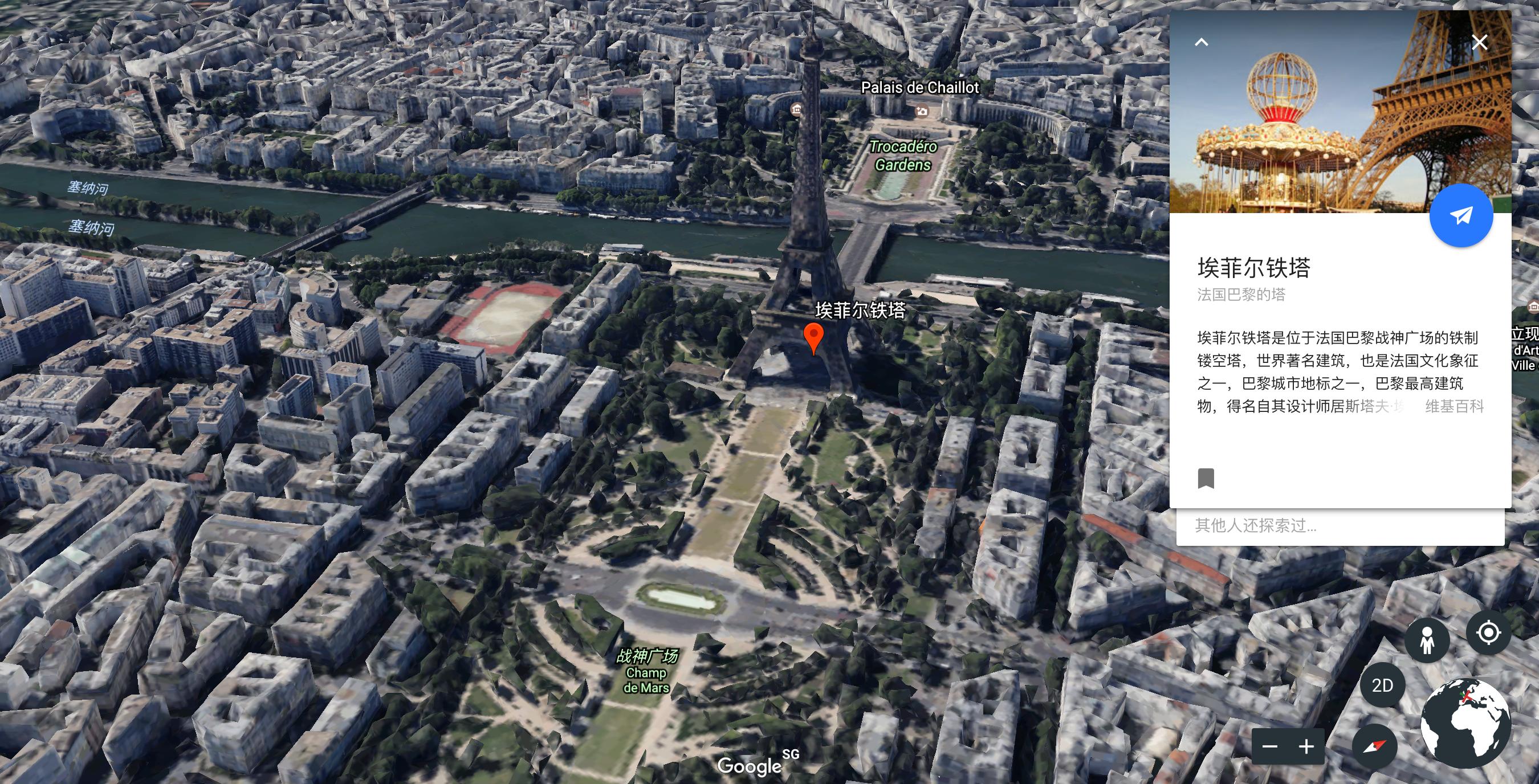 Google Earth为了使体验更加真实,所做的不仅仅有这些。2016年11 月 16 日,Google 在其官方博客宣布推出一款称为 Google Earth VR 的免费新应用。该应用支持 HTC Vive 头戴设备,用户足不出户,就可以在 VR 世界中尽情遨游,探索世界各地的文化瑰宝,浏览不同的地标建筑,享受站在世界之巅的感觉。