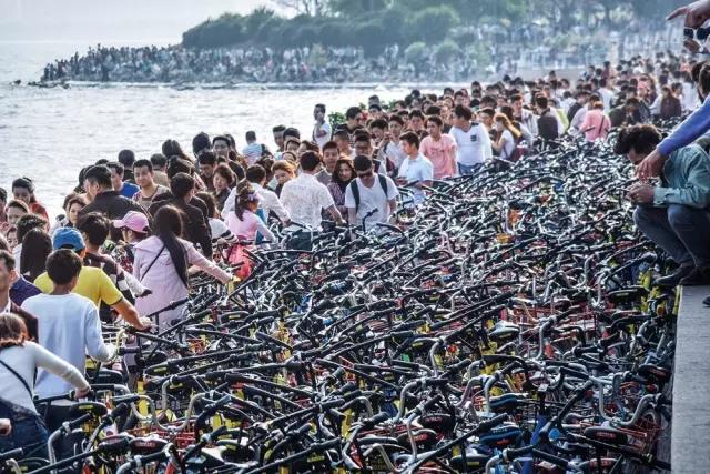 (2017年4月3日,清明小长假第二日,深圳湾的游客将大量的共享单车停放在栈道上。图/CFP)
