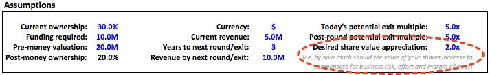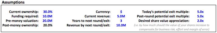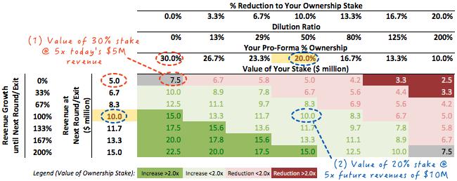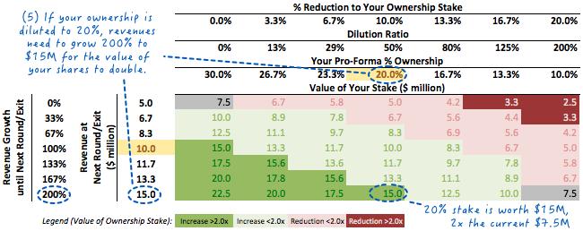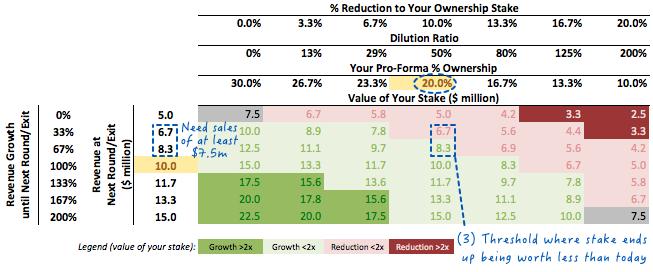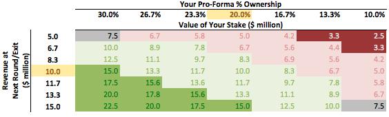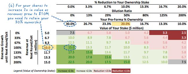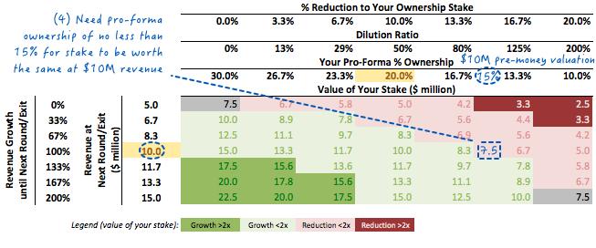 (4)如果您坚信3年内收入增长将达到1000万美元,那么您可以将您的所有权从30.0%降低到15.0%(即接受价值$1000万的投资前估值),你仍然能保证不亏(但也不赚)。