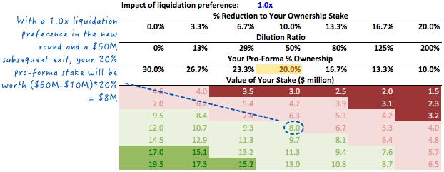 上文提到的清算优先权又是怎么一回事呢? 想要建模多个清算优先权的影响是十分复杂的,超出了本分析的范围,但Excel中的单独表格展示了清算优先权的方向性影响。在上面的例子中,如果你的收入从500万美元增加到1000万美元,1.0x的清算优先权意味着额外的上涨空间几乎不存在。