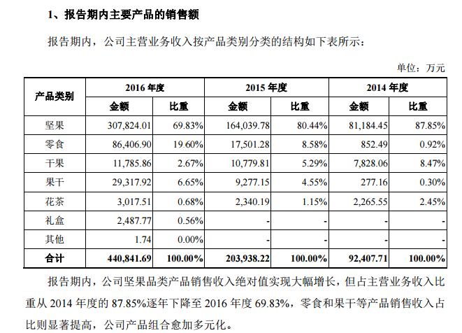 因此,公司也在丰富产品线。虽然坚果产品的经营业绩情况对公司业绩仍具有较大影响,乐观的是,坚果产品的营收保持在比较高速的同时,其占主营业务的收入比重也在逐渐下降。(2014 年度、2015 年度以 及 2016 年度坚果产品的销售收入分别为 8.11 亿、16.4亿、30.8亿,同比增长约翻倍,但占主营业务收入的比重分别为约九成、八成、到七成。)