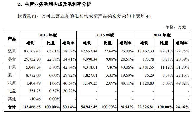 另一方面,新增品类的毛利率都比坚果要高,零食和果干(芒果干、榴莲干等)的销售比重,也在逐年增长,原来只占不到1%的零食,在2016年已经占超过两成。