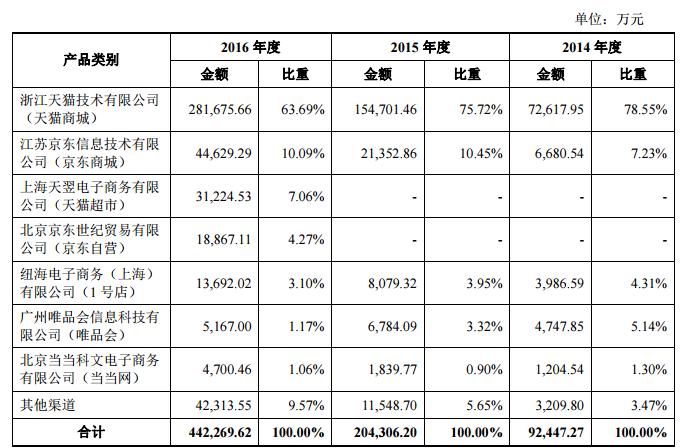 三只松鼠的特别之处在于,它营业之处,纯粹依靠互联网渠道销售,据其招股书内公布的销售渠道分析,互联网销售渠道占其销售额的90%以上,其中来自天猫(包括天猫商城和天猫超市)的占70%;其次是京东,占约14%。可见,三只松鼠是名副其实的“淘品牌”。