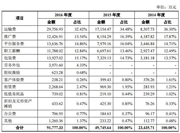 从其销售费用占比来看,恰恰就是跟其独特的互联网销售渠道和IP化推广方式有关。根据招股书,其运输费、推广费和平台服务费,占销售费用中比较大的比例。