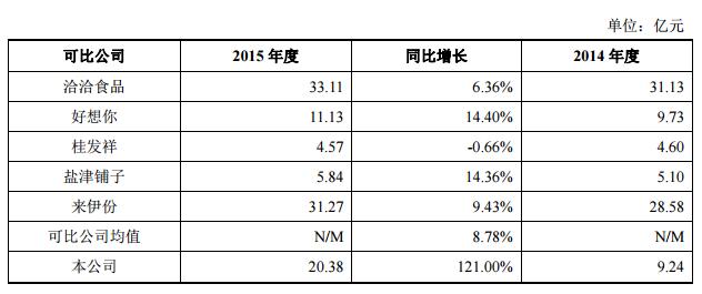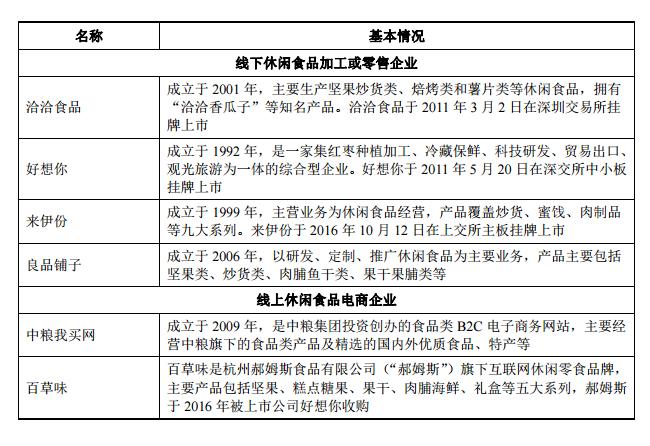根据三只松鼠招股书,目前上市公司中尚未有完全可比的公司,在A股上市公司中,洽洽食品、好想你、 桂发祥、盐津铺子、来伊份,为相对可比公司。