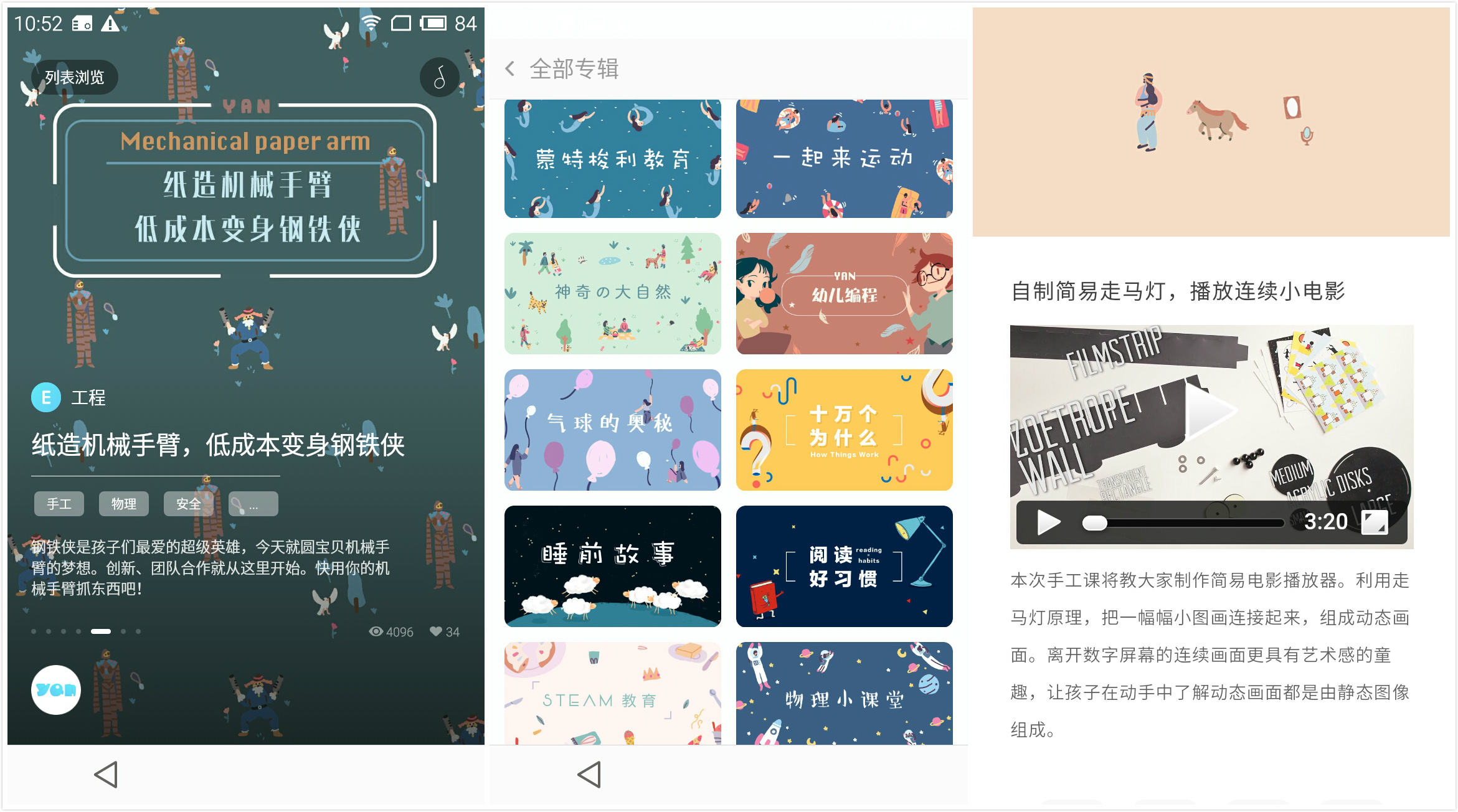 今天要介绍的“童yan”,是一款针对3-6岁的学龄前儿童教育App。创始人兼CEO陈达树向36氪介绍,与市场上常见的育儿App不同,“童yan”的教育内容围绕 STEAM 教育方法展开,即科学(Science)、技术(Technology)、工程(Engineering)、艺术(Art)、数学(Mathematics)。STEAM 教育强调与现实相关联,让孩子自己动手完成他们感兴趣且和生活相关的项目,在动手实践过程中学习各种跨学科的知识,培养创新意识。
