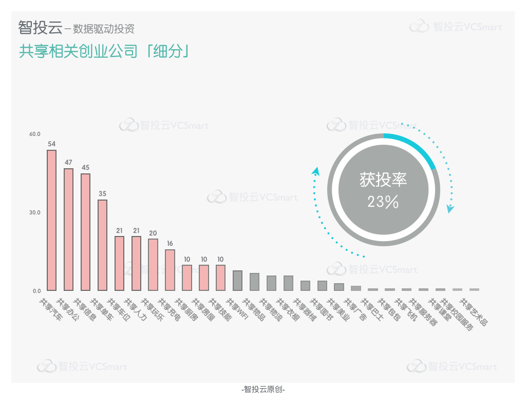 从细分上看,智投云将329个公司归为26个细分,最为火爆的包括共享汽车,共享办公,共享单车以及共享车位。从显示的融资数据看,近23%的公司获得投资,由于行业的特殊性,不排除未披露的融资信息,所以这个比例会相对比较高一些。