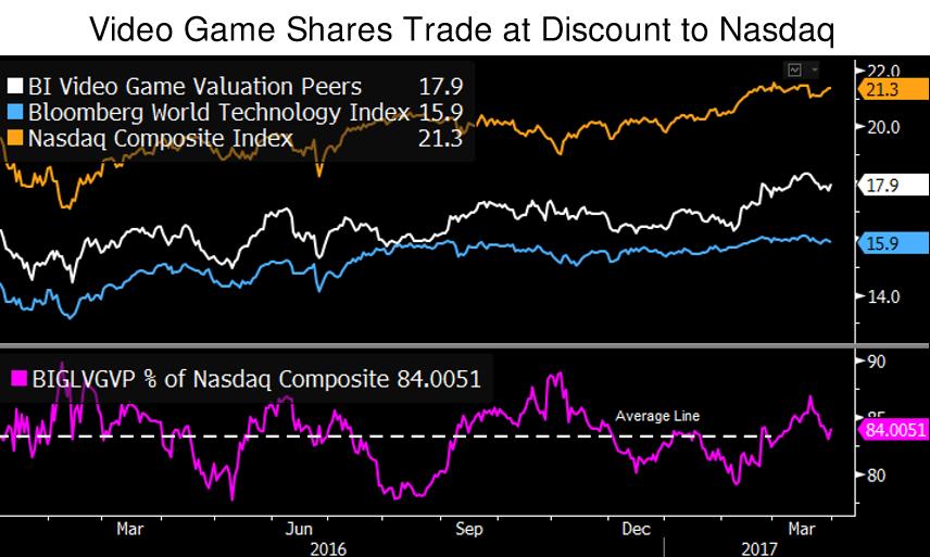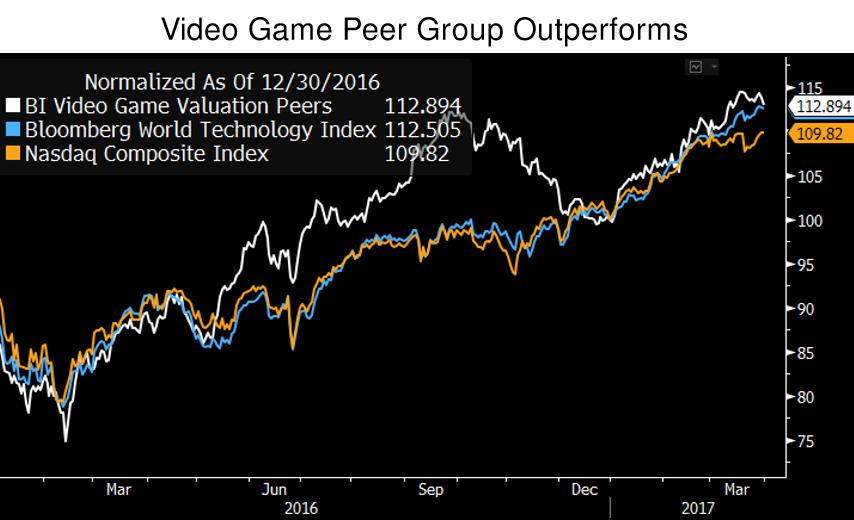 截止2017年3月,Bloomberg Intelligence 全球视频游戏估值同业组合指数已经上涨12.9%,Bloomberg 全球科技指数上涨了12.5%,纳斯达克综合指数上涨了9.8%。