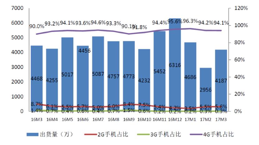 据中国通信院《2017 年3 月国内手机市场运行分析报告》,2017年3月,国内手机市场出货量4187.1万部(注:含非智能手机),同比下降6.3%;上市新机型128款,同比下降31.2%。