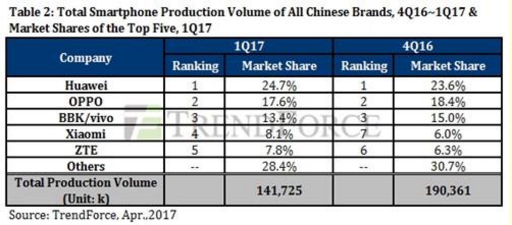 此前最让人关注的小米手机的增长情况,到了2017年第一季度还是没有得到很好的缓解。小米手机的出货量和上一季度相比差异不大,但总体排名重新回到中国前五。