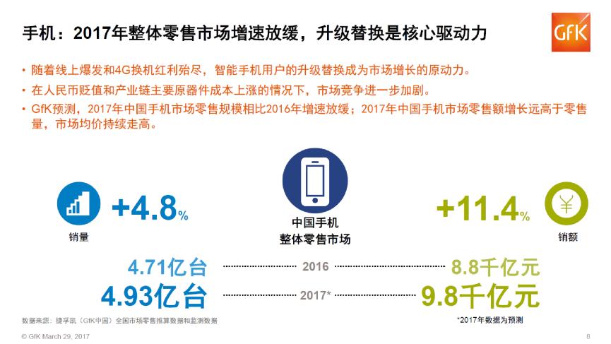 最后GfK预测,2017年中国手机市场零售规模相比2016年增速放缓;2017年中国手机市场零售额增长远高于零售量,市场均价持续走高。