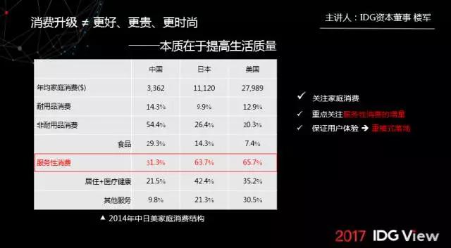 这个现象背后的含义是,当一个家庭越来越接近中产水平,他们的钱更多会花在体验上,而不是从一年买40件衣服增加到明年买80件,要提高的是生活质量。因此,我们认为服务性消费增量是一个重要的大方向,做消费升级更应该关注家庭消费;如果大方向偏了,做任何创业都有可能变成小而美的事情。