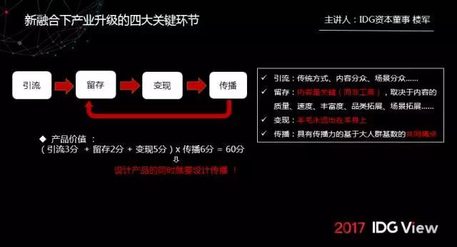 如果我们用分数去衡量四个环节,前面三个是加法,最后是乘法。某个产品的价值如果引流有3分,留存2分,变现5分,这个产品加起来可能是10分,乘上传播的6分,这个产品就是60分。还有一点要特别注意的,千万不要在产品做好之后,再想着怎么传播,而是在设计产品的时候,就要把传播结合进去。