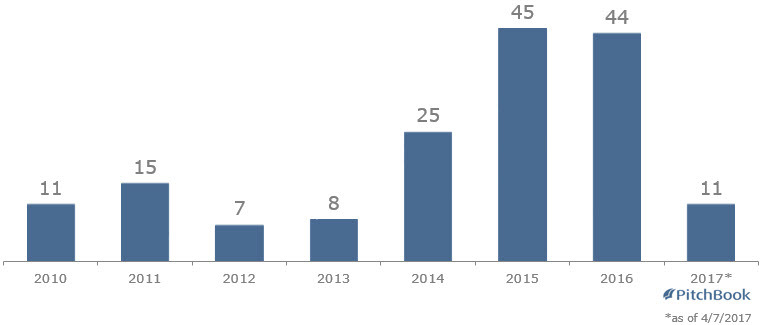 根据PitchBook的数据,自2010年以来,中国企业者在美国共完成166笔交易,略高于2015年和2016年,年平均完成约22笔交易。而这些数据和加拿大以及欧洲的企业者在美国进行并购的案例形成了鲜明的对比。