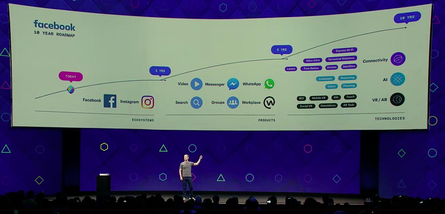 在近日举办的Facebook F8大会上,马克·扎克伯格再次描绘了公司未来十年的远大发展计划。以下这张图正是他演讲时提到的战略蓝图: