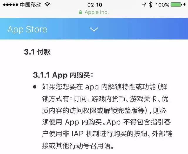 2010年,Apple推出应用内购买(IAP)机制,规定若要在应用内解锁特性或功能,就是说若要向用户提供额外的收费功能,必须采用IAP机制让用户完成购买,Apple抽取交易额的30%。第二年。Apple升级了它的《App Store审核指南》,禁止在应用中明示或暗示用户绕开IAP机制。
