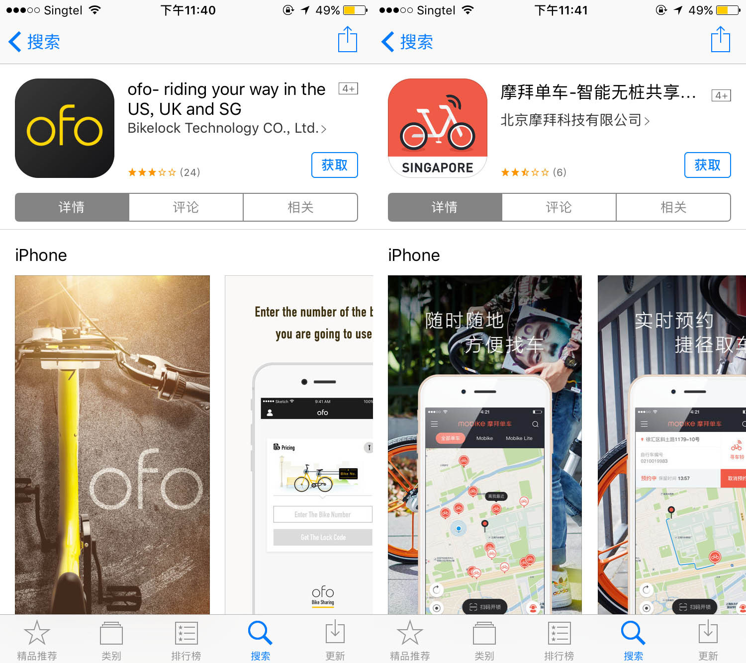 这样的情形让我们意识到:或许两家单车都有新加坡定制版App。于是,在把App Store的地区和国家切换到新加坡,搜索之后还真的有: