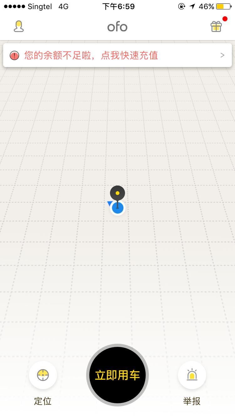 既然中国区下载的摩拜App可以显示,那么ofo呢?我们也试了一下,结果是完全无法识别,仅仅显示一个位置图标: