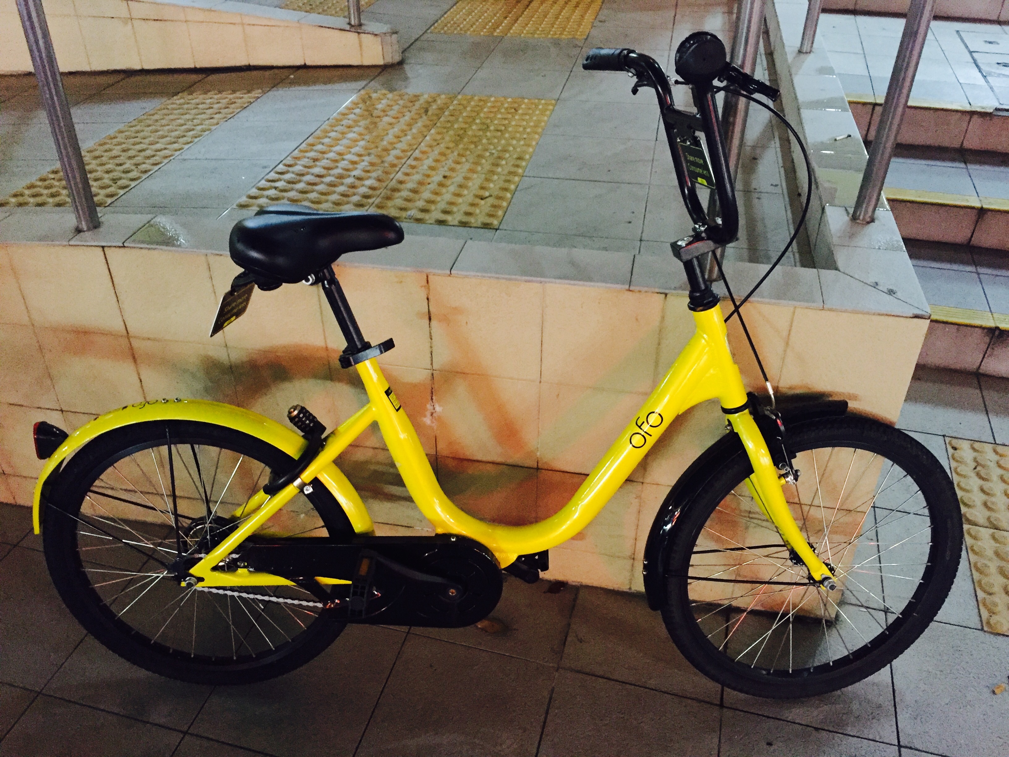 与摩拜单车偶尔可以看到几辆,ofo几乎见不到。终于,傍晚沿着地铁沿线的街道遛弯时,碰到了一辆ofo小黄车,形单影只的依靠在栅栏边。