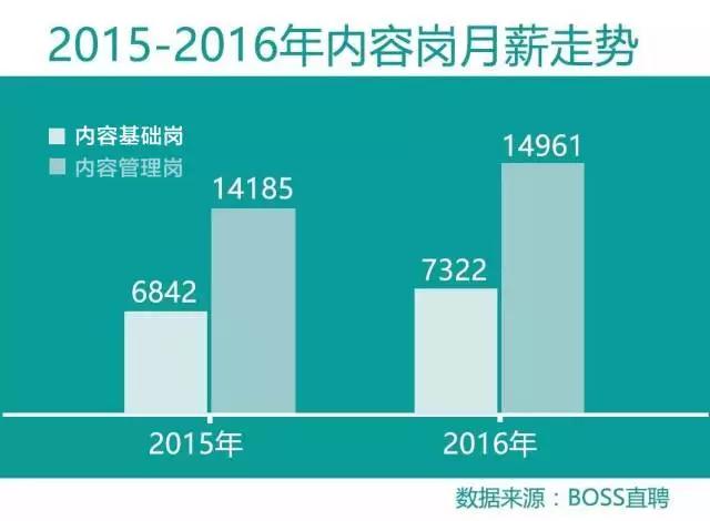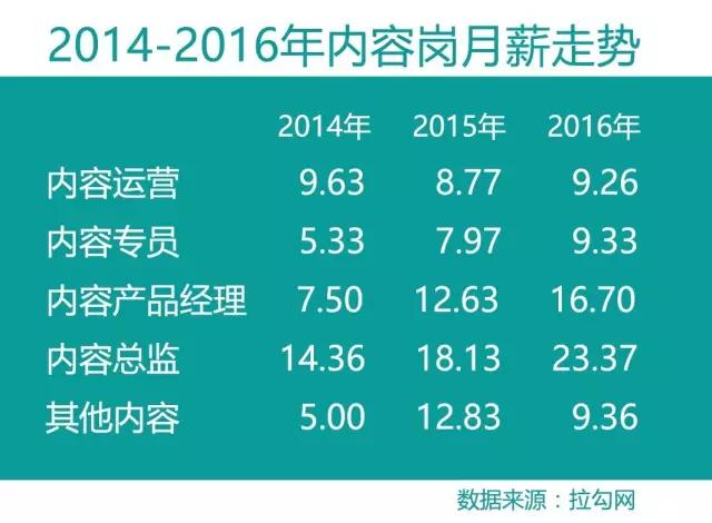 根据近日拉勾网提供给刺猬公社的数据,内容总监2016年的平均薪酬是2014年近两倍,其他内容岗如内容运营、内容专员、内容产品经理等的薪酬也呈快速增长趋势。
