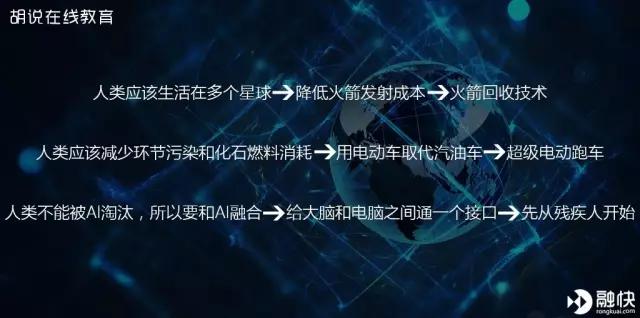 他的新公司Neuralink打算给大脑研发一个接口,未来愿景的第一步是要在人脑中植入电极来治疗疾病;第二步是采集并放大脑部微弱的神经信号;第三步是完成脑信号的输出和解码。先利用这种技术治疗癫痫、帕金森等脑功能障碍疾病,逐渐实现真正的人机互联。让每一个普通人都能拥有最强大脑,知识不再需要上课学习,而是像黑客帝国Neo学习武术那样直接植入记忆,通过数据线下载便可以立即学会。