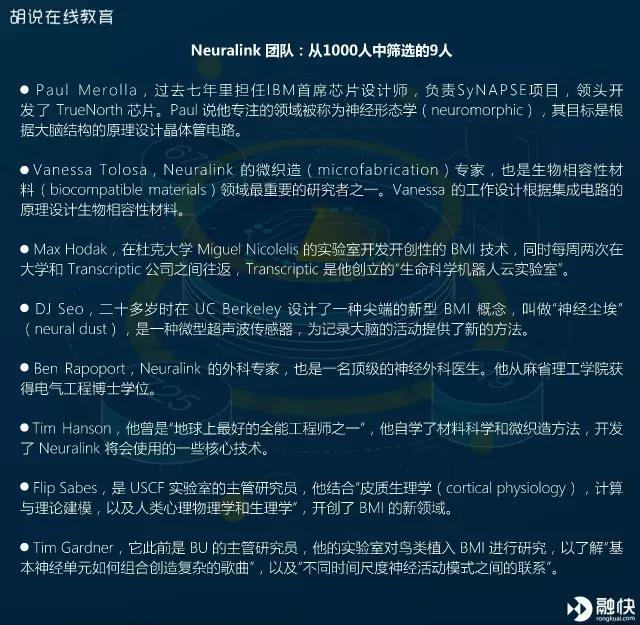 Neuralink并不是从头研究怎么跟大脑通讯,他们创始团队的几位成员是从上千位精英挑选出来的精英,都在大脑通讯的科研领域/工作中做出过突出的贡献。现有的最大问题是,精度高的传感器中,能够跟踪的神经元少,能够一下子跟踪所有神经元的仪器(例如核磁共振)精度却不高。Neuralink要做的就是精度高,跟踪的神经元多,又同时能够便携的人脑通讯设备。