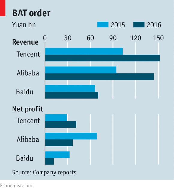 阿里巴巴是中国最大的电商集团,每年处理的交易量比易趣和亚马逊加起来的还多。马云大boss承诺20年内全球用户数要达到20亿。腾讯专营网游和社交媒体,现在已经是全球第十大最有价值的公共企业,市场价值约2750亿美元。腾讯CEO马化腾希望中国“主导未来全球科技革命”。但随着两家公司在国际上名声响亮,曾经并称为互联网三大巨头“BAT”的第三个成员百度却显得滞后了,当初谷歌为避开审查制度离开中国,百度也是一度称霸大陆市场的网络搜索公司。