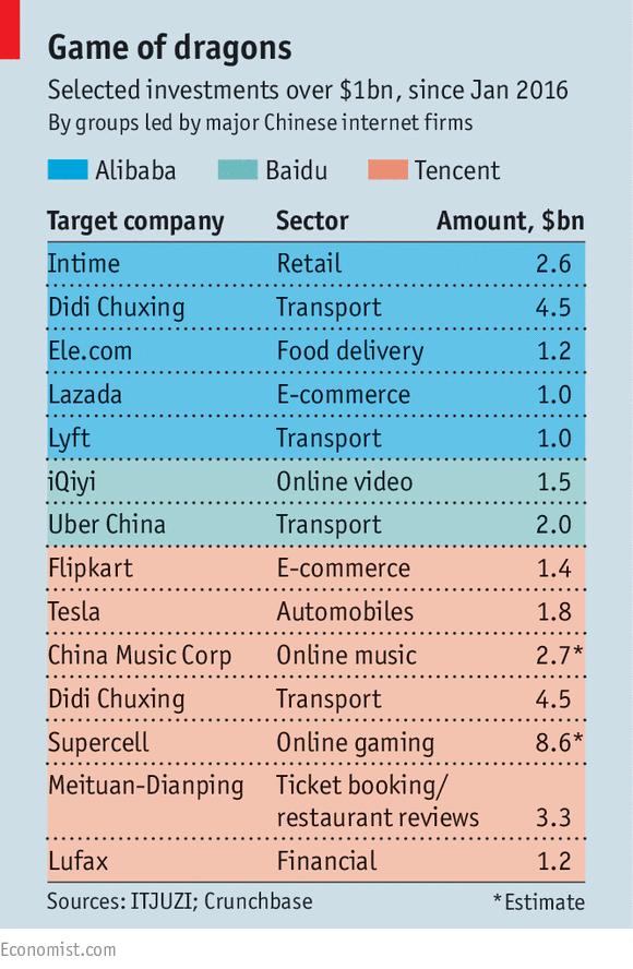 这些投资一直处于腾讯的核心领域,离阿里巴巴和百度的地盘远远的。有时如果他们并没有预谋的话,三家也会以合作收场。BAT公司都是滴滴出行的投资人。但在其他领域,他们的国内战争正继续向国外市场蔓延。