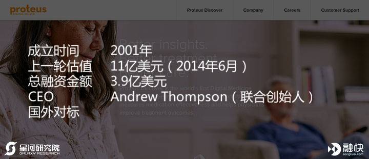 Proteus Digital Health是电子药片研发、制造,并计划构建疾病综合管理平台的公司,目前最核心的产品是用于治疗慢性病的智能药片Proteus Discover,2015年开始商业化应用,其由可消化芯片、腹部感应贴片、移动终端APP 和云平台组成。
