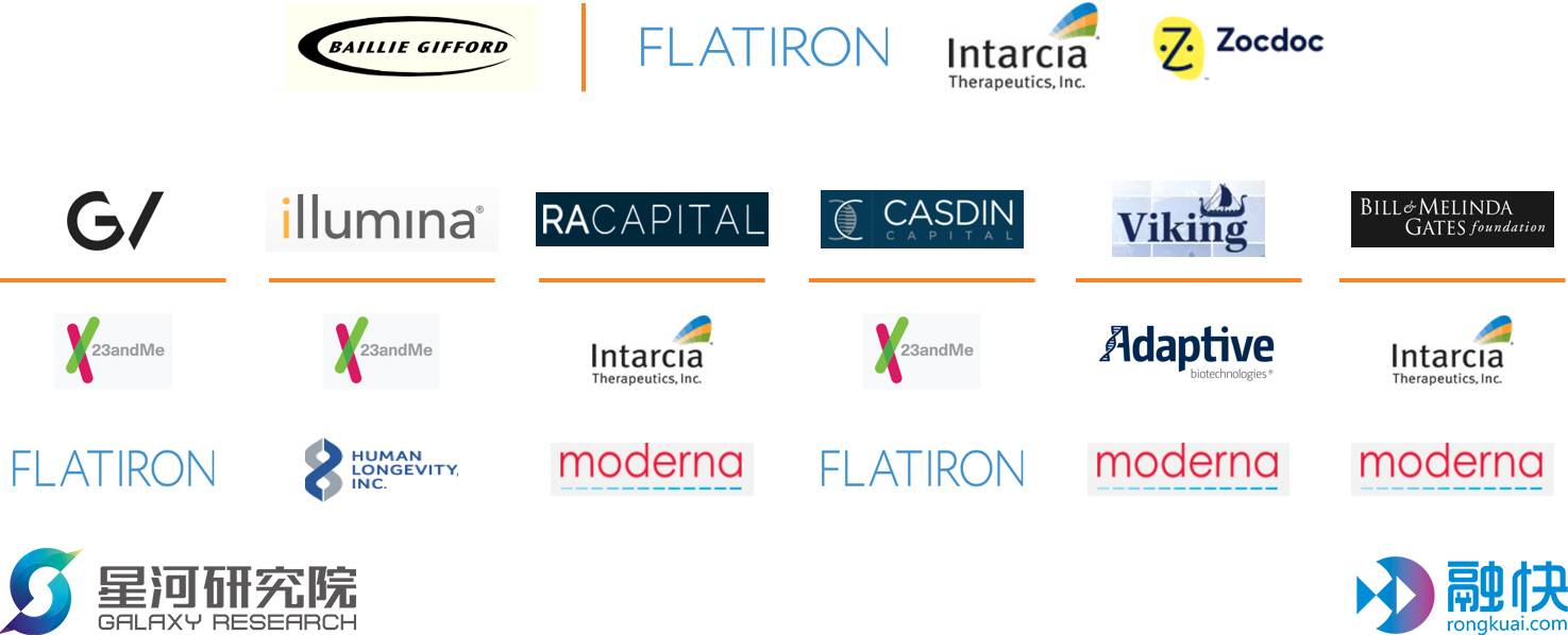 2、医疗和生命科学领域投资独角兽的投资机构多达125家,数量最多的是英国的一家风投机构Baillie Gifford。此外还有16家分别投资了2家独角兽,其中有10家是一些主流VC和大型投行机构,其他6家比较有特色,包括corporate VC: Google Ventures和基因测序设备制造商Illumina,专门投资生物科技的VC: RA Capital, Casdin Capital和Viking Global Investors,还有比尔和梅琳达·盖茨基金会。