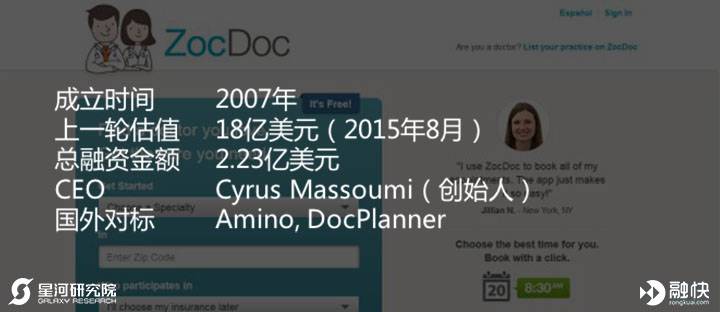 Zocdoc是基于地理位置的线上医生预订平台,其成立的初衷是希望能够帮助人们更快地找到医生看病,并得到满意的服务。ZocDoc网站列出了每位内科医生的保险计划和预约日程,用户可以在网站或者移动客户端通过ZocDoc找到附近医生,并且根据上述信息及医生的档案点评、资质认证等选择合适医生,确认服务时间并完成预定。ZocDoc的盈利模式为对入住平台的医生收取 3000 美元的年费,从而将服务免费提供给用户。