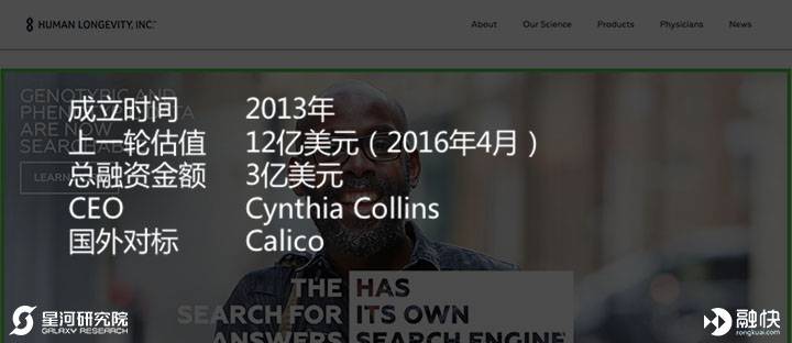 Human Longevity是一个基因测序的大数据公司,通过“万人基因组测序计划”,组建最为全面和完整的人类基因型、微生物学和表现型数据库,应对年老引发的人类生物学衰退有关的疾病,实现“人类长寿计划”的目标。