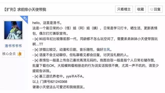 “扩列”是95、00后的黑话,即扩充好友列表,等同于交新朋友的意思。我们从00后经常出没的网络平台发现,“扩列”的帖子为多数内容。在“扩列”的帖子中,会放上基本信息和兴趣标签,凸显个性化,并附上一张自己的照片。如下图: