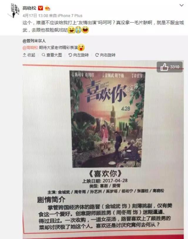 《喜欢·你》则打出一手演员牌,不止金城武周冬雨在戏中狂撒狗粮,高晓松、林志玲等大咖露面也令人惊喜不断,“真没拿一毛片酬啊,就是不服金城武,去跟他茬脸彪戏哒!”在微博上,“矮大紧”不忘拿男神开涮。