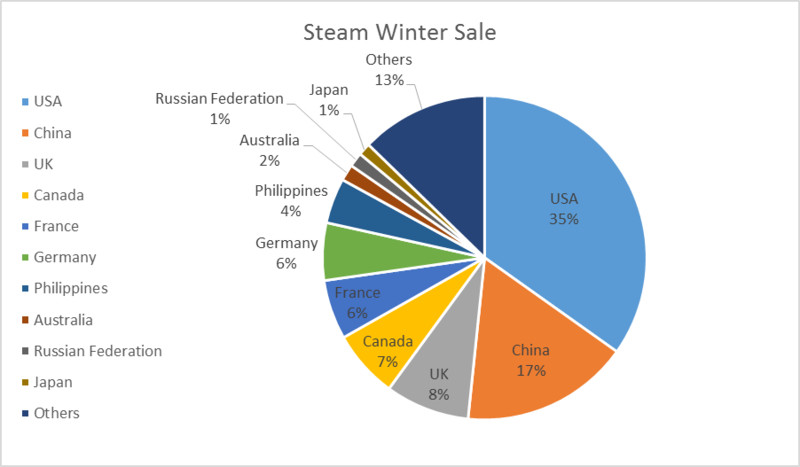 2)Steam 2016 Winter Sale 中,中国区收入超越英国、加拿大位列第二,占全球总销售的 17%。