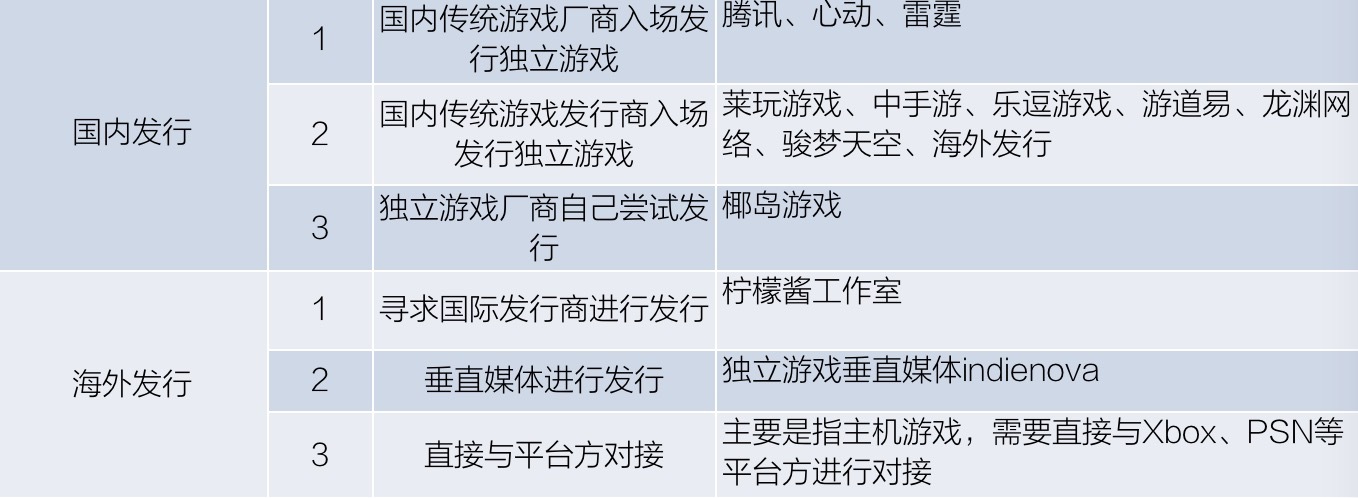 基于海外独立游戏用户付费模式的成熟,出海是国内多数独立游戏开发方的必选项。此外,目前在国内独立游戏的发行市场已涌入包括网易游戏、飞鱼科技、心动网络、凉屋游戏、椰岛游戏、中手游、4399、冰穹互娱等在内超过 30 家发行渠道。