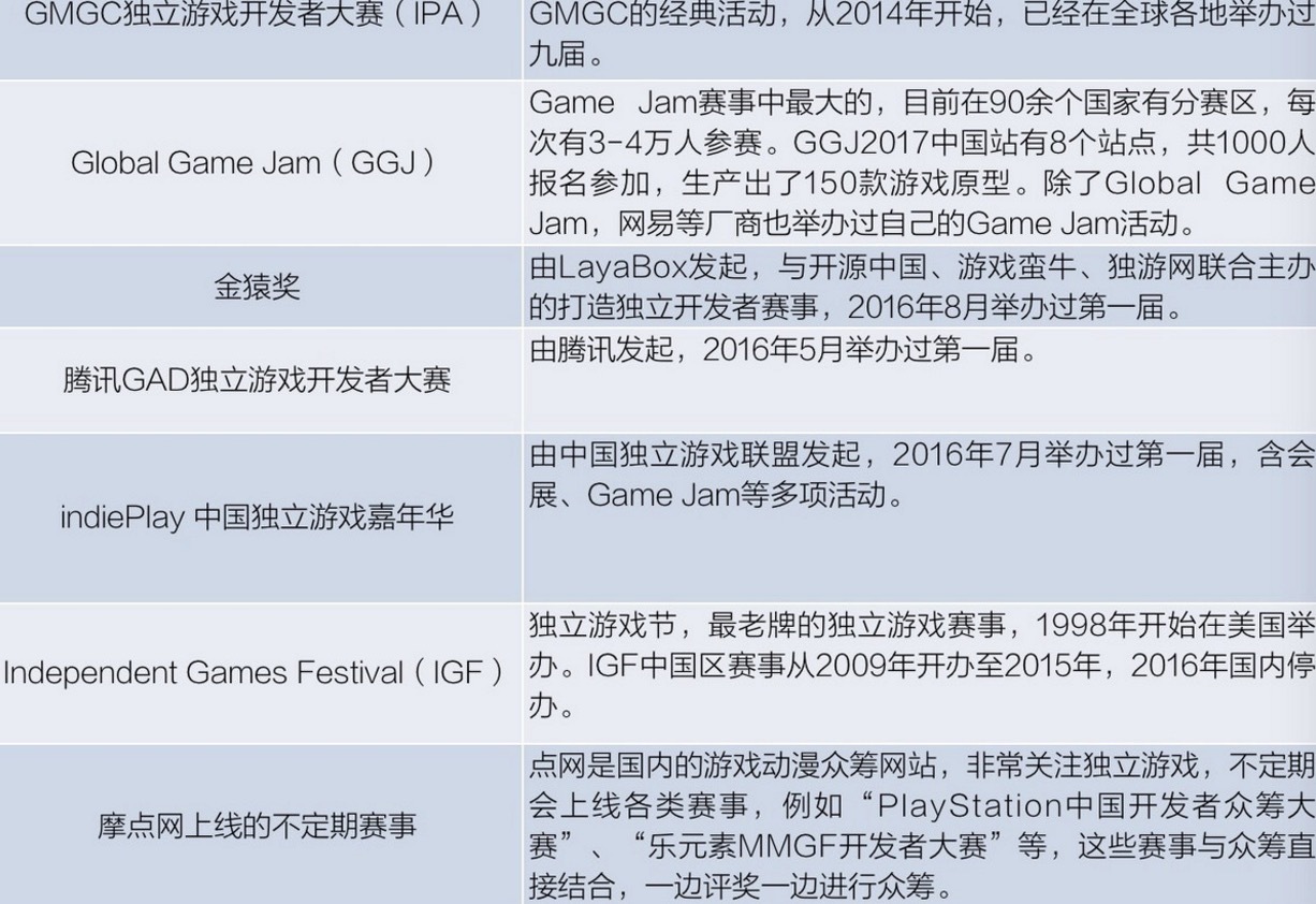 大部分优秀独立游戏团队都会选择参赛,以获得关注度和奖金,因此,赛事活动也是挖掘优秀标的、优秀团队的好地点。目前国内主要的独立游戏活动有: