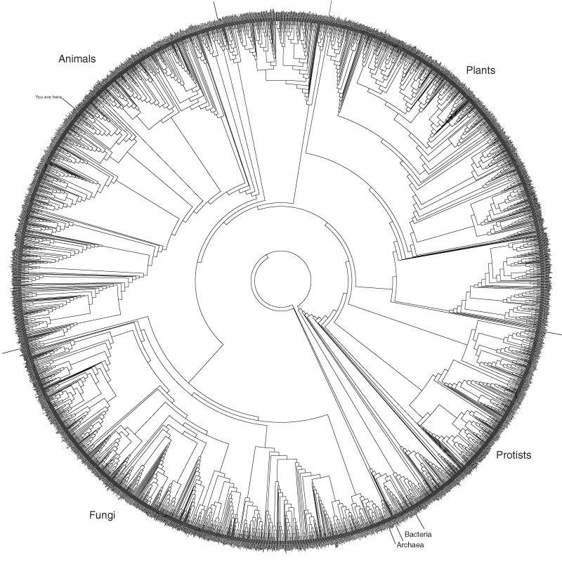 物种自然演进的一个更加精确的图表是一张向外辐射圆盘,就像上面基于DNA的这张,这是德克萨斯大学的David Hillis先设计出来的。这个系谱曼荼罗从中间最原生的生命形式开始,然后按照时间顺序向衍生。时间向外迁移所以今天生活在地球的最近的生命物种是出现在这个圆圈的边缘。这张图强调了进化很难被认识到的一个基础事实:现存的每一个物种都是平等演进的。人类跟蟑螂、蛤蚌、蕨类植物、狐狸和细菌一样都位于圆圈的外沿。这些物种每一个都经历了30亿年未曾间断过的成功繁殖。也就是说,今天的细菌和蟑螂跟人类一样是高度进化的。没有阶梯这一说。